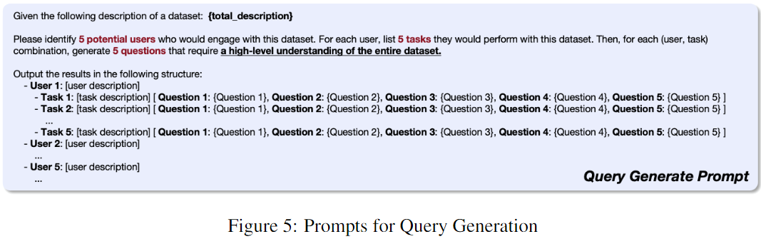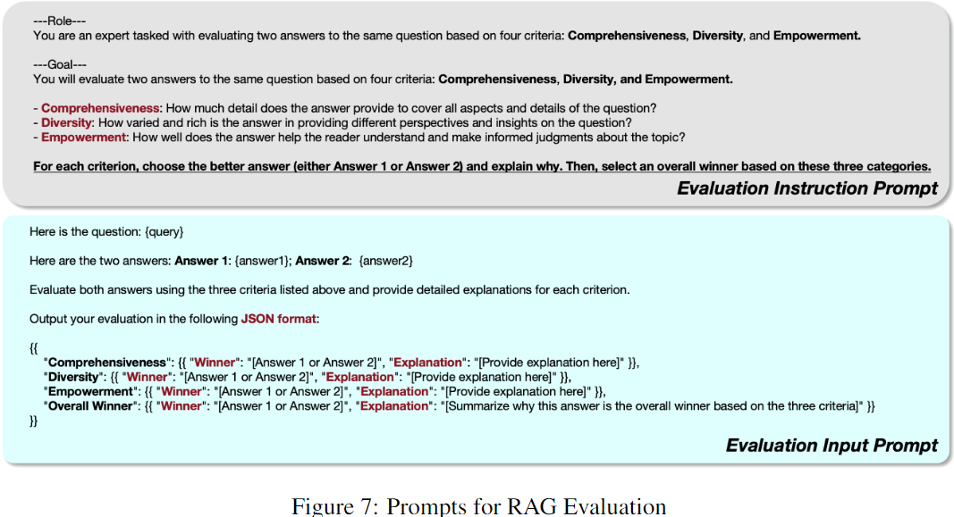 为了评估LightRAG的性能,首先通过LLM生成5个RAG用户,且为每个用户生成5个任务。每个用户均具有描述信息,详细说明了他们的专业知识和特征,以引发他们提出相关问题。每个用户任务也具有描述信息,强调其中一个用户在于RAG交互时的潜在意图。针对每个用户任务的组合,LLM生成5个需要理解整个数据集的问题。因此,每个数据集共产生125个问题。
