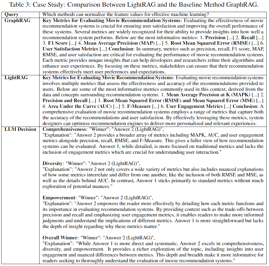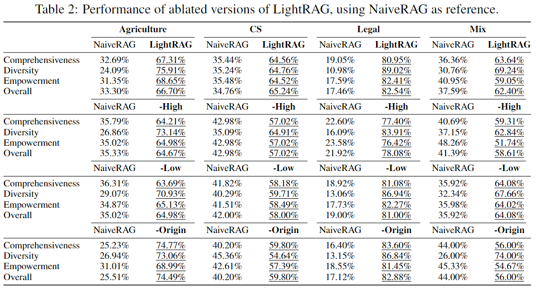 此外,通过将图结构与向量表征相结合,LightRAG促进了相关实体和关系的有效检索,同时基于结构化的知识图谱中相关的信息,增强了结果的全面性。