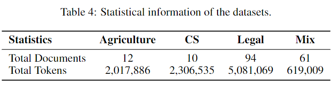 从UltraDomain基准中选取了4个数据集,分别包括农业、计算机科学、法律、混合集,每个数据集包含60W-500W个token。
