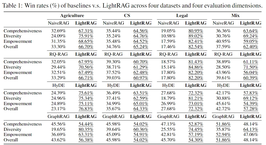 评价标准采用基于LLM的多维度比较方法,使用GPT-4o-mini针对LightRAG与每个基线的响应进行排名。主要包含如下4个维度:全面性(回答多大程度解决了问题的所有方面和细节)、多样性(与问题相关的不同观点,答案的多样性和丰富性如何)、接受度(答案是否有效使读者理解主题并做出明确判断)、整体评价(评估前三个标准的累积评价)。