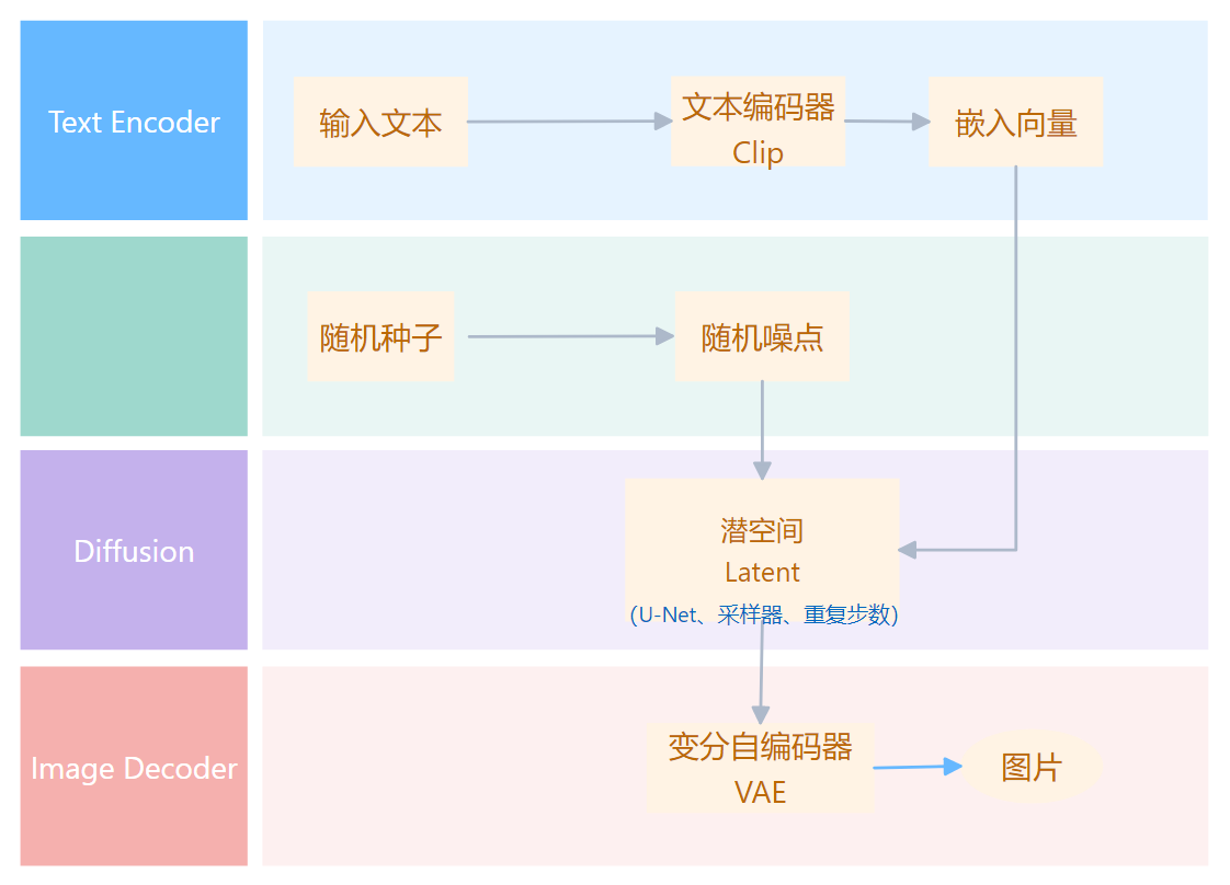 把提示词和种子传给模型,经过降噪和扩散,最后 VAE 修复,图片生成。