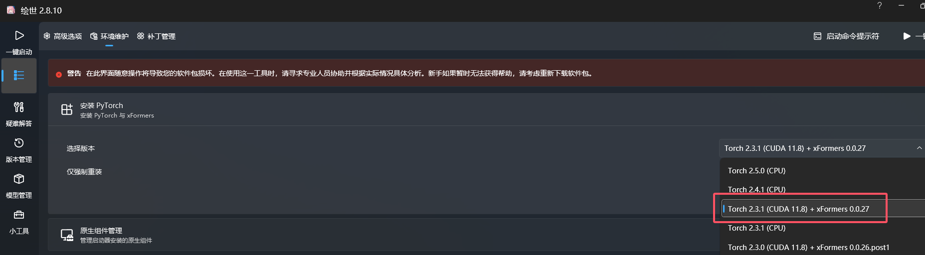 这里选秋叶的绘世整合包,解压后打开,高级选项-环境维护-安装 PyTorch