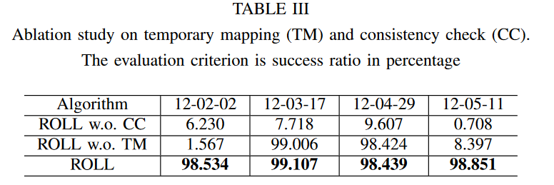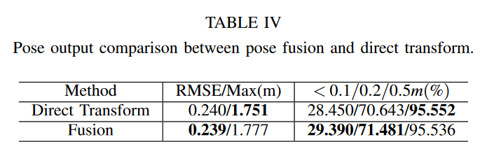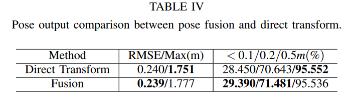 为了评估所提出的方法对整个算法的贡献,我们进行了两组消融实验。第一组实验对四个序列进行,以证明临时建图和一致性检查的必要性,如表III所示。选择成功率作为评价标准。如果没有临时建图,当访问序列“12-02-02”中发生显着变化的区域或序列“12-05-11”中部分未建图的区域时,算法有时会失败。此外,消融实验也清楚地解释了一致性检查的必要性。原来的融合方法,如果不加修改就直接使用的话,连百分之十的会话都无法处理。对所有序列进行第二组实验,以比较位姿融合(方程 9)与直接变换(方程 1),如表 IV 所示。在最大误差略有牺牲的情况下,位姿融合总体上表现出更好的误差百分比。