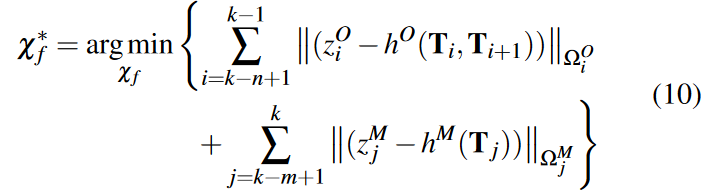 其中马哈拉诺比斯范数 ‖r‖Ω = rT Ω−1r。协方差矩阵ΩO i 和ΩG i 根据经验设置为常数对角矩阵。然后,通过替换附近的历史特征关键帧,将优化后的临时关键帧合并到全局地图中。