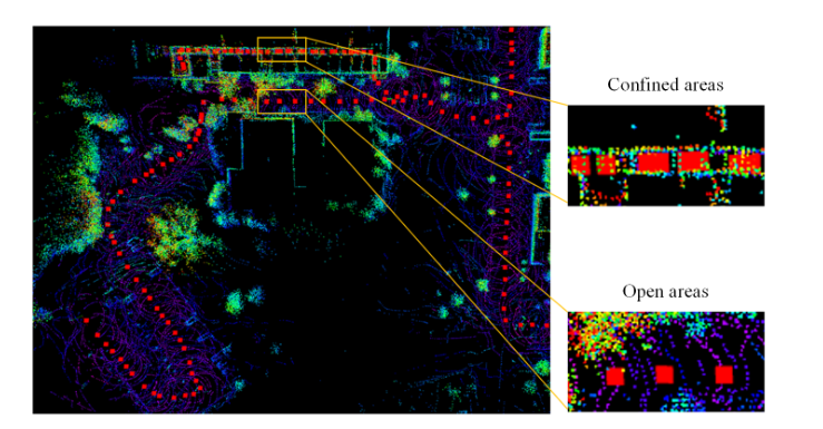 图 4. 定位系统中使用的地图演示。地图在开放区域和受限区域使用不同尺寸的滤镜进行处理,每个红点代表一个特征关键帧。右两图是黄色矩形区域的放大图,在图中的右上方可以观察到较密集的红点。