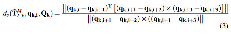对于投影后的每个表面点 qk,i ∈ Sk,通过 kdtree 搜索找到表面图 Qk 中最近的三个点 qk,i+1、qk,i+2、qk,i+3。残差是点到面的距离: