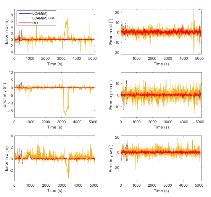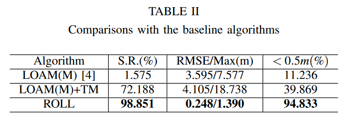 比较:在表 II 中,我们将我们的算法与序列“12-05-11”上最先进的 LiDAR SLAM LOAM [4] 的变体进行了比较。具体来说,对于“LOAM(M)”,我们使用与 ROLL 相同的地图表示形式来保存和加载地图,但我们仅匹配没有点云注册的预构建地图。对于“LOAM(M)+TM”,我们将临时建图集成到“LOAM(M)”中,以便为场景更改启用地图更新。为了公平比较,这两种基线算法也使用地面实况地图,并且用于比较的定位位姿是通过 LiDAR 里程计和建图之间的直接转换生成的,类似于等式 1。因为并非所有算法都能在整个会话中生存,我们定义一个成功率(S.R.)来指代所有激光雷达帧中 ei 小于一米的帧的比例。由于临时建图,“LOAM(M)+TM”在鲁棒性上比“LOAM(M)”有显着提高。在 LIO 和融合算法的辅助下,ROLL 的性能优于两者。位置误差比较如图 6 所示。“LOAM(M)”由于进入部分未建图区域而在 440 秒左右失败; ROLL和“LOAM(M)+TM”都可以在整个会话中生存,但ROLL的误差明显小于“LOAM(M)+TM”。