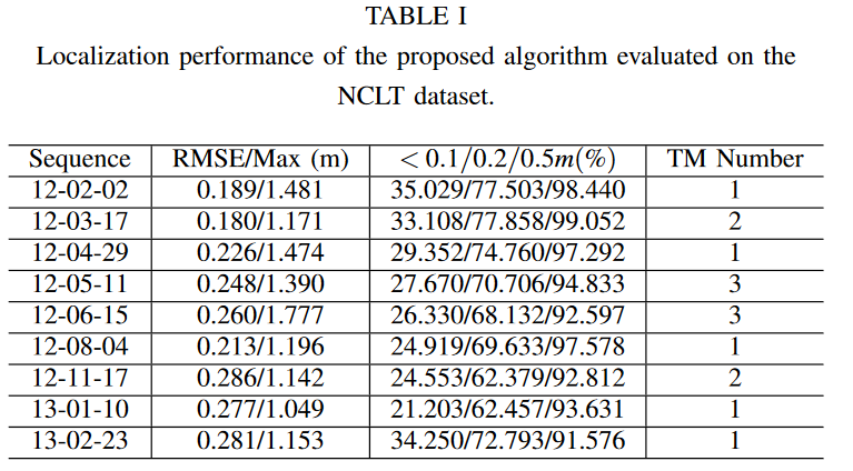 所有实验均在配备 Intel Xeon W-2102 CPU@2.9 GHz 和 16 GB RAM 的台式机上进行。该算法在 NCLT 数据集的 10 个序列上进行了测试 [7]。 NCLT数据集是由UGV(无人车)采集的大规模、多模态、长期的解剖数据集地面车辆)在北密歇根大学北校区工作了一年多。覆盖室内外环境,场景变化多样,如下雪、树叶飘落、建筑施工、长廊开门关门等。例如,白天下雪“12-01-15 ”、“13-01-10”、“13-0223”(为简单起见,使用序列记录的日期“年月日”来指代序列)。此外,序列“12-05-11”和“12-11-17”覆盖了一些未探索的区域,这需要定位系统能够扩展预先构建的地图。数据集的地面实况是从所有会话的 RTK(实时运动学)GPS 和 LiDAR 扫描匹配的大型离线 SLAM 解决方案中获得的。