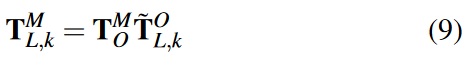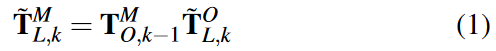 位姿融合的关键是获得优化的里程漂移(表示为 TM O ),因为我们输出位姿估计与 LIO 一样快。每个里程计位姿的实时位姿输出 ̃ TO L,k :