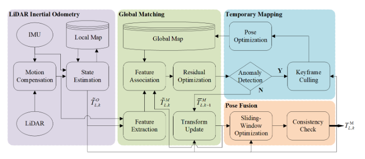 • 我们提出了一个包含临时建图的强大的全局匹配模块,可以防止在场景发生重大变化或地图覆盖不足的区域中出现定位失败。一旦匹配再次可靠,就可以将临时地图合并到全局地图上。