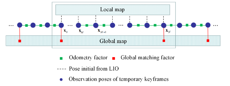 2)关键帧剔除:当μk低于某个阈值μE时,系统进入临时建图模式。在此模式下,TM L,k 不再用于变换更新,并且使用常数 TM O,k 从 LIO 变换而来的机器人位姿用于剔除特征关键帧。剔除策略与构建全球地图时使用的策略相同。这些关键帧与历史关键帧不同,只是暂时存在,因此被称为“临时关键帧”。请注意,当未检测到地图异常时,临时关键帧会以滑动窗口方式保留一定数量的帧。如图 3 所示,在位姿 xM 处开始临时建图之前,已经存储了由具有全局匹配位姿的最近观察结果组成的 M − 1 个临时关键帧。它是为以后的位姿优化而设计的,因为当面对显着的地图异常时,xM 附近的全局匹配位姿被认为是不可靠的。同时,正在计算 μk 以用于具有更高阈值 μM 的潜在地图合并。一旦 μk 高于 μM,全局匹配位姿 ̄ TM L,k 被认为再次可靠,可以更新 TM O,k 。