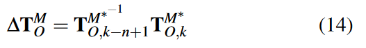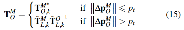 其中 ΔTM O = {ΔpM O , ΔqM O }。如果距离变化 ∥ ∥ΔpM O ∥ ∥ 超过某个阈值,则认为优化陷入局部最优。为了重置该值,我们使用最近的里程计位姿和全局匹配位姿来获得里程计漂移,其可以表示为: