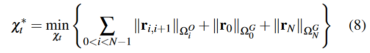 其中 ̃ xi 表示来自可靠全局匹配的位姿约束。通过求解非线性最小二乘问题来优化残差: