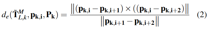 利用位姿猜测̃ TM L,k,对特征关键帧的观察位姿进行一定距离内的kdtree搜索,提取附近的云进行匹配。相应的特征关键帧一起形成为一个局部边缘图Pk和局部表面图Qk。这些局部建图存储在两个 kdtree 中,以便在优化过程中进一步快速搜索。对于每个边缘点 pk,i ∈ Ek 用 ̃ TM L,k 投影到图框上后,通过 kdtree 搜索找到局部边缘图 Pk 中两个最接近的点 pk,i+1、pk,i+2。残差是点到线的距离: