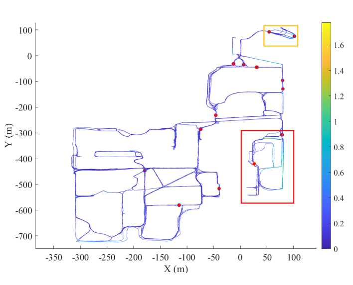 每个会话仅激活临时建图几次。激活位置在误差轨迹中标记,如图 5 所示。地图异常的两个示例用黄色和红色矩形标记。从误差轨迹中,我们可以观察到红色矩形标记的区域相对于其他区域表现出更大的定位误差。这可以通过该地区的地图扩展来解释。黄色矩形标记的区域是图1中提到的停车场。该区域非常开放,可用于匹配的稳定特征很少,提示激活临时建图。