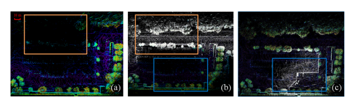 图 7. 地图更新演示。注意圆圈区域。 (a)“11年5月12日”之前部分未测绘区域的点云地图鸟瞰图; (b) 与(a)相同的视图,在“12-0511”天更新地图后,白色点云是合并的临时地图; (c) 与 (b) 相同的视图,在“12-06-15”天更新地图后,我们可以观察到施工围栏已更新到全局地图上。
