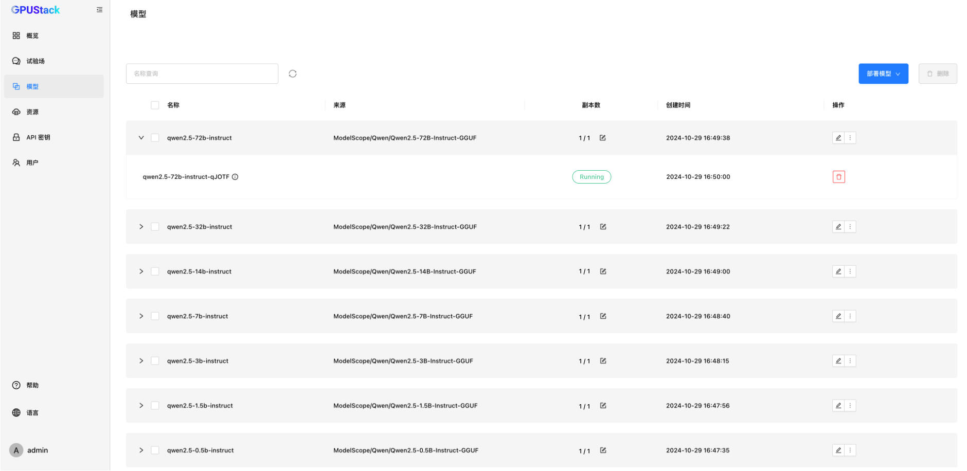 在 GPUStack 的模型菜单中部署模型。GPUStack 支持从 HuggingFace、Ollama Library、ModelScope 和私有模型仓库部署模型,国内网络建议从 ModelScope 部署。