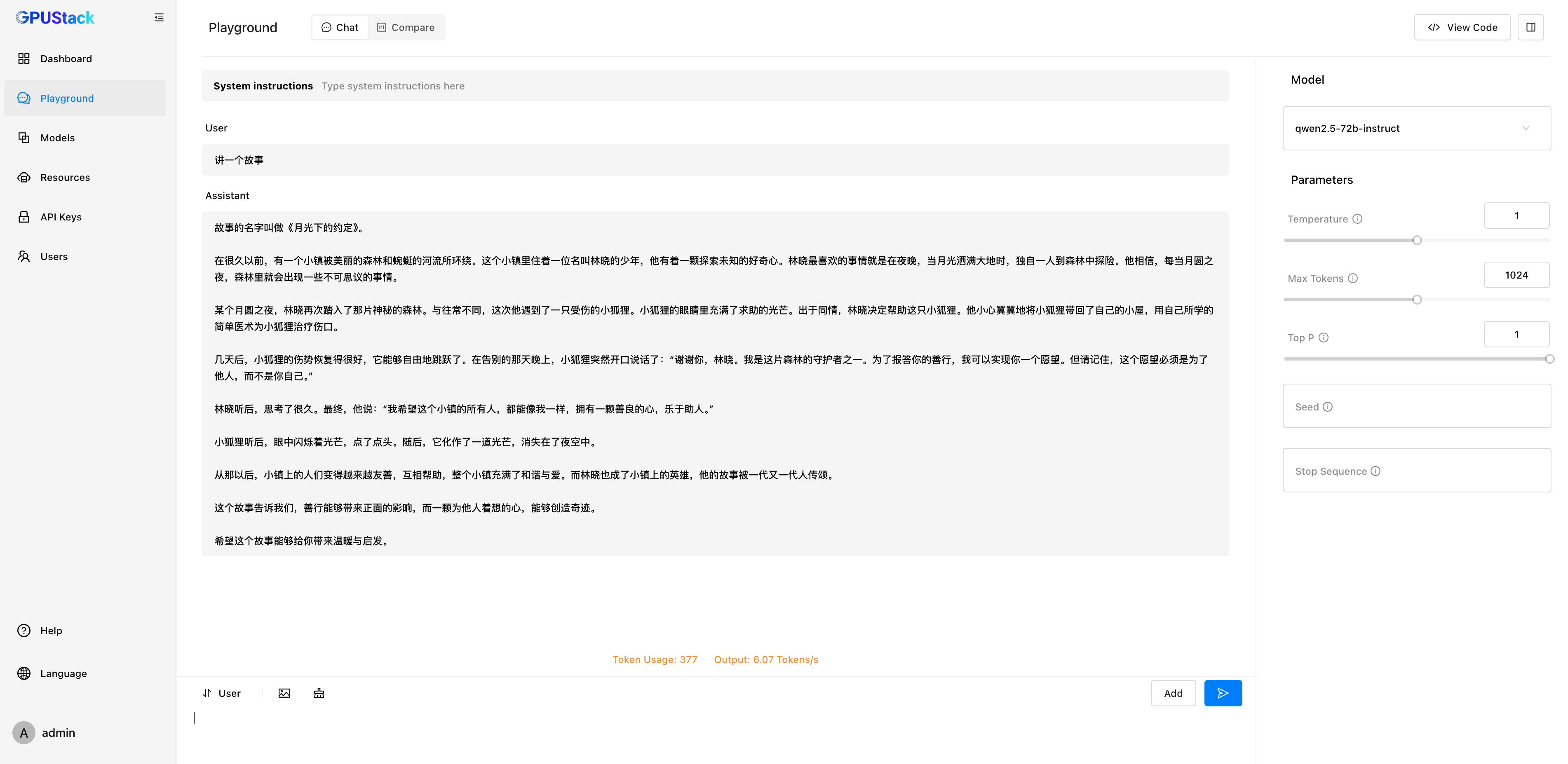 多模型对比:GPUStack 在 Playground 中提供了多模型对比视图,可以同时对比多个模型的问答内容和性能数据,以评估不同模型、不同权重、不同 Prompt 参数、不同量化、不同 GPU、不同推理后端的模型 Serving 效果
