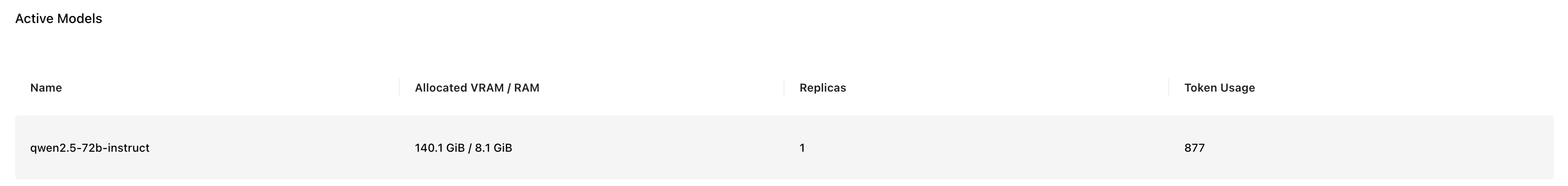 在 Dashboard 可以看到 Qwen 2.5 72B 被分配了 140.1 GiB 显存和 8.1 GiB 内存: