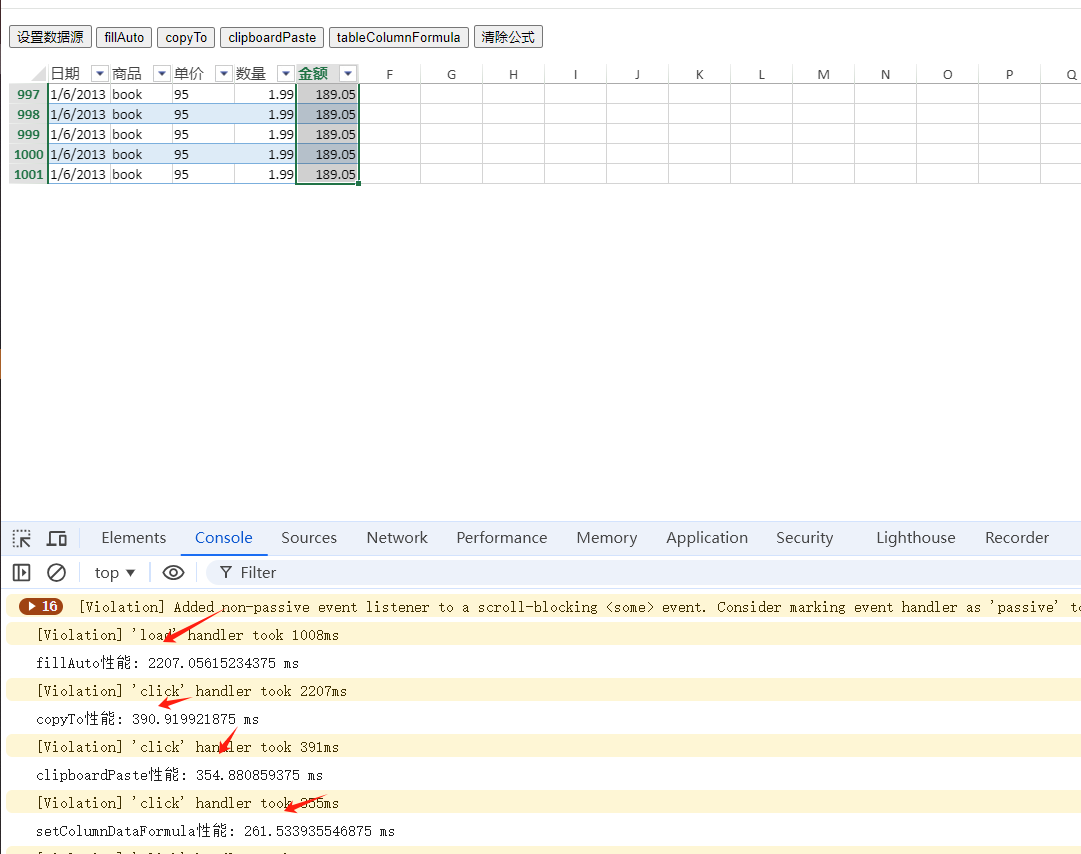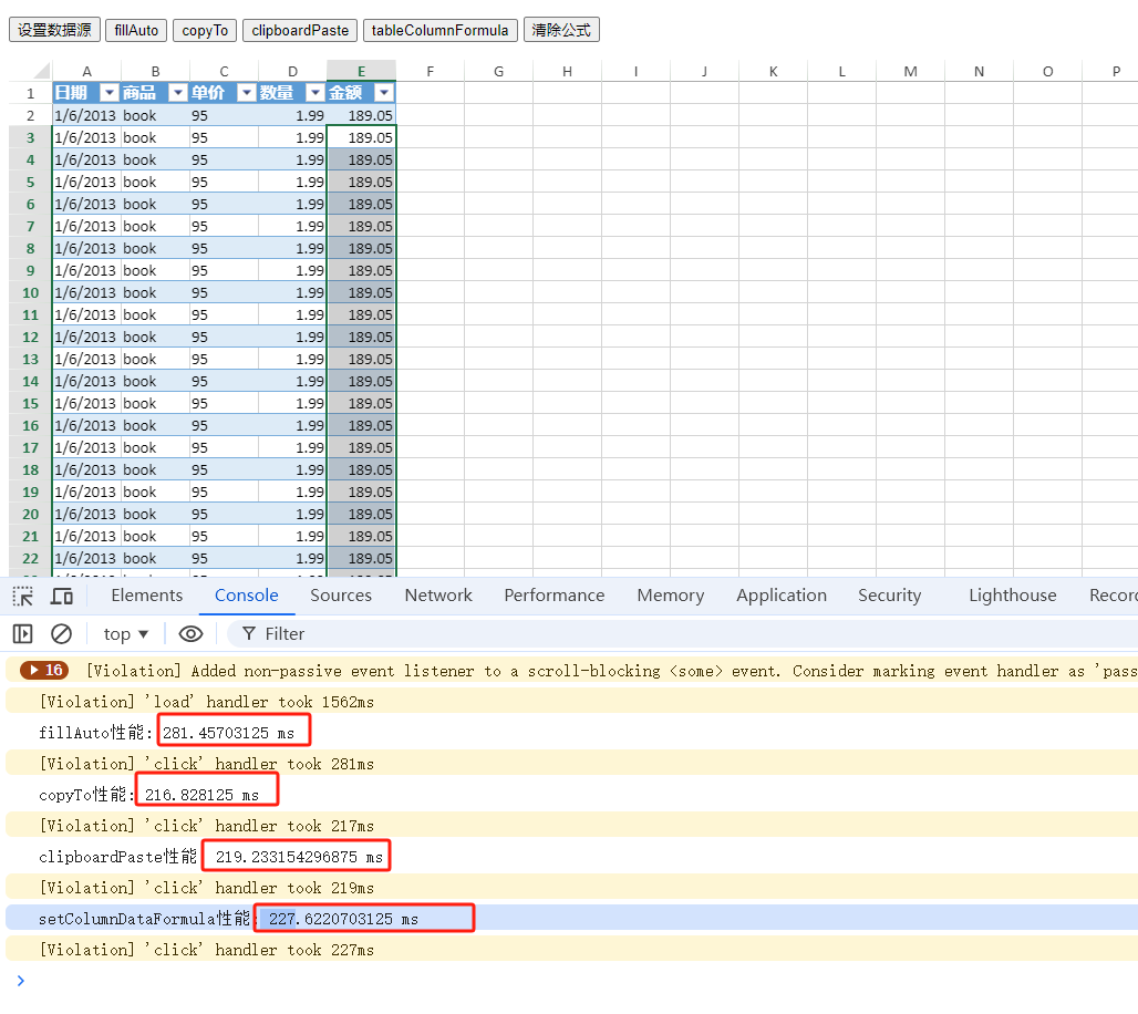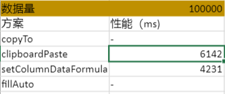 我们接下来将数据量改为10万条数据,观察setColumnDataFormula与clipboardPaste性能