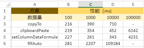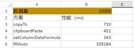 观察上图,我们发现setColumnDataFormula与clipboardPaste性能较好,而fillAuto性能最差。