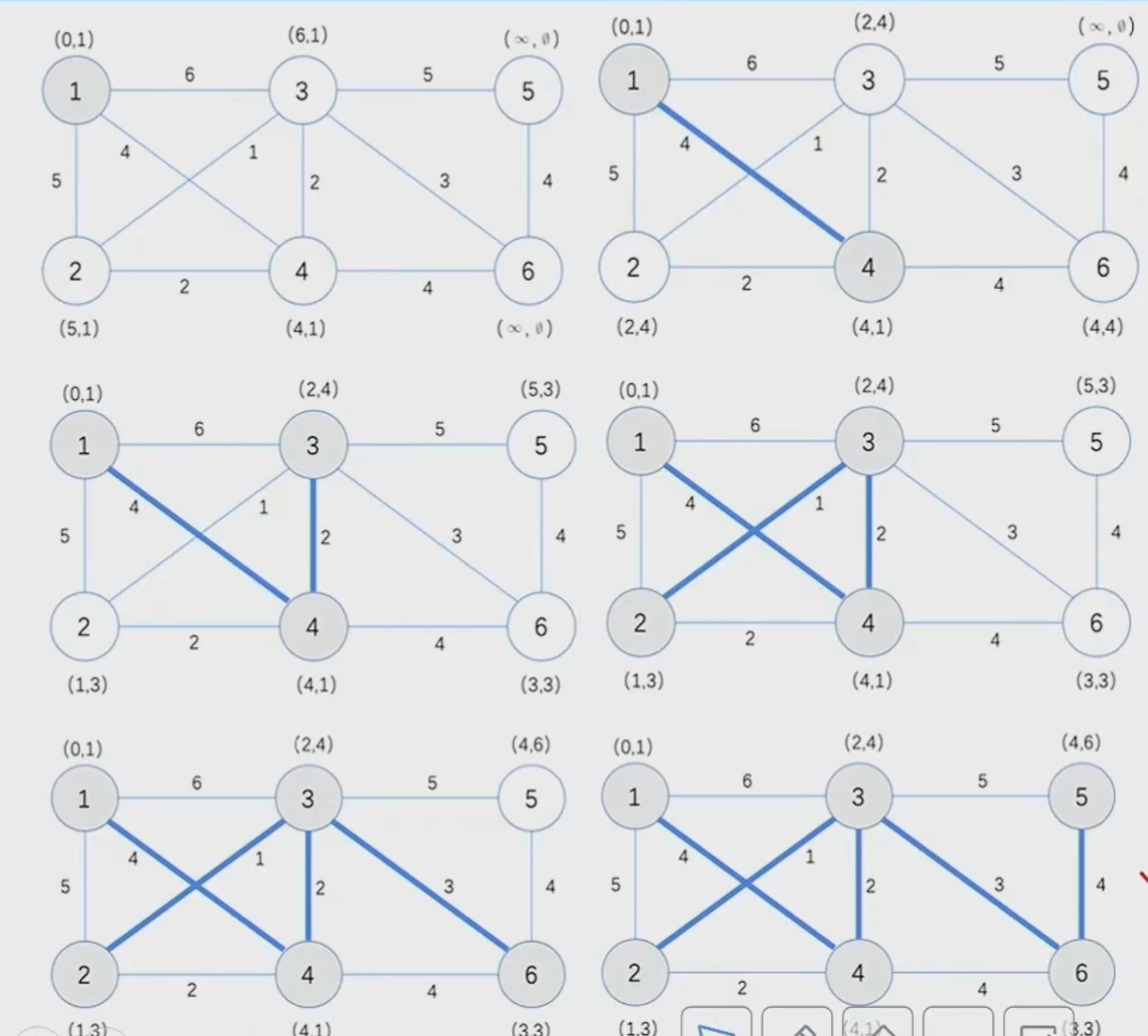 (4)重复步骤(2)和(3),直到所有的节点都加入到\(T\)中。