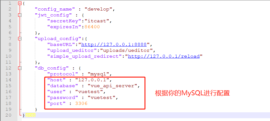修改项目的配置文件:你的项目路径\vue_api_server\config\default.json