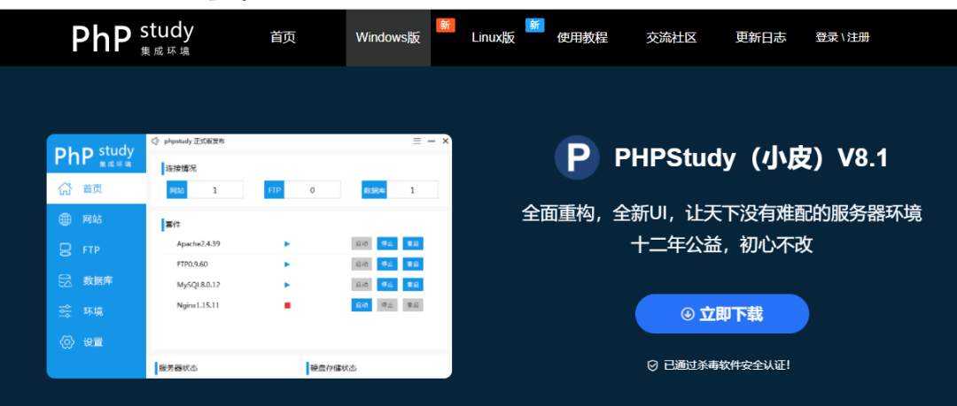 如果没有安装过MySQL,可以访问网址:https://www.xp.cn/download.html,根据你的操作系统,下载对应的phpstudy软件。