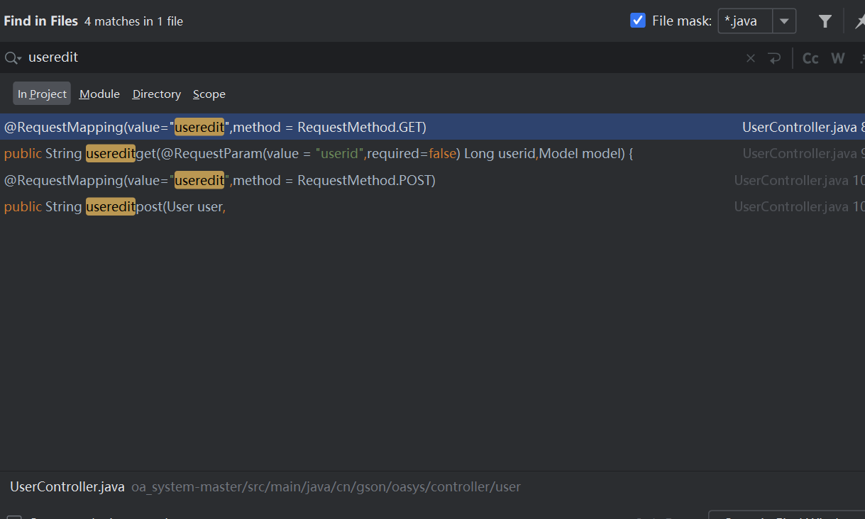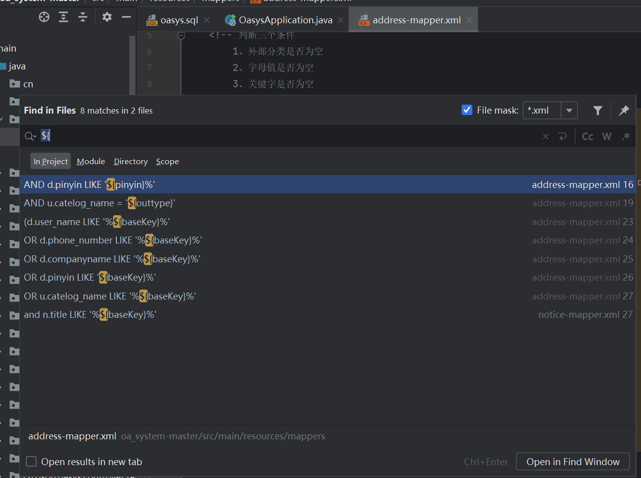 定位到接口层,于是找接口实现类,发现无,于是全局搜索该接口名称,找哪里引用了此接口:
