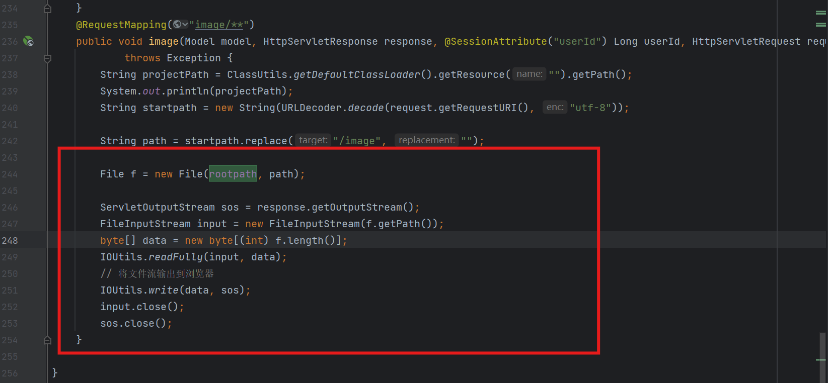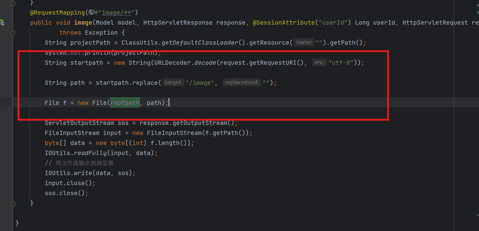 如上红框代码,f.getPath()的值来自于rootpath与path的拼接,而path的值则是,先通过request.getRequestURI()获取,再将/image替换为空得来。