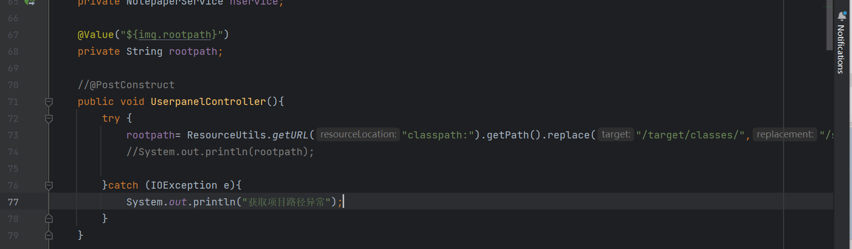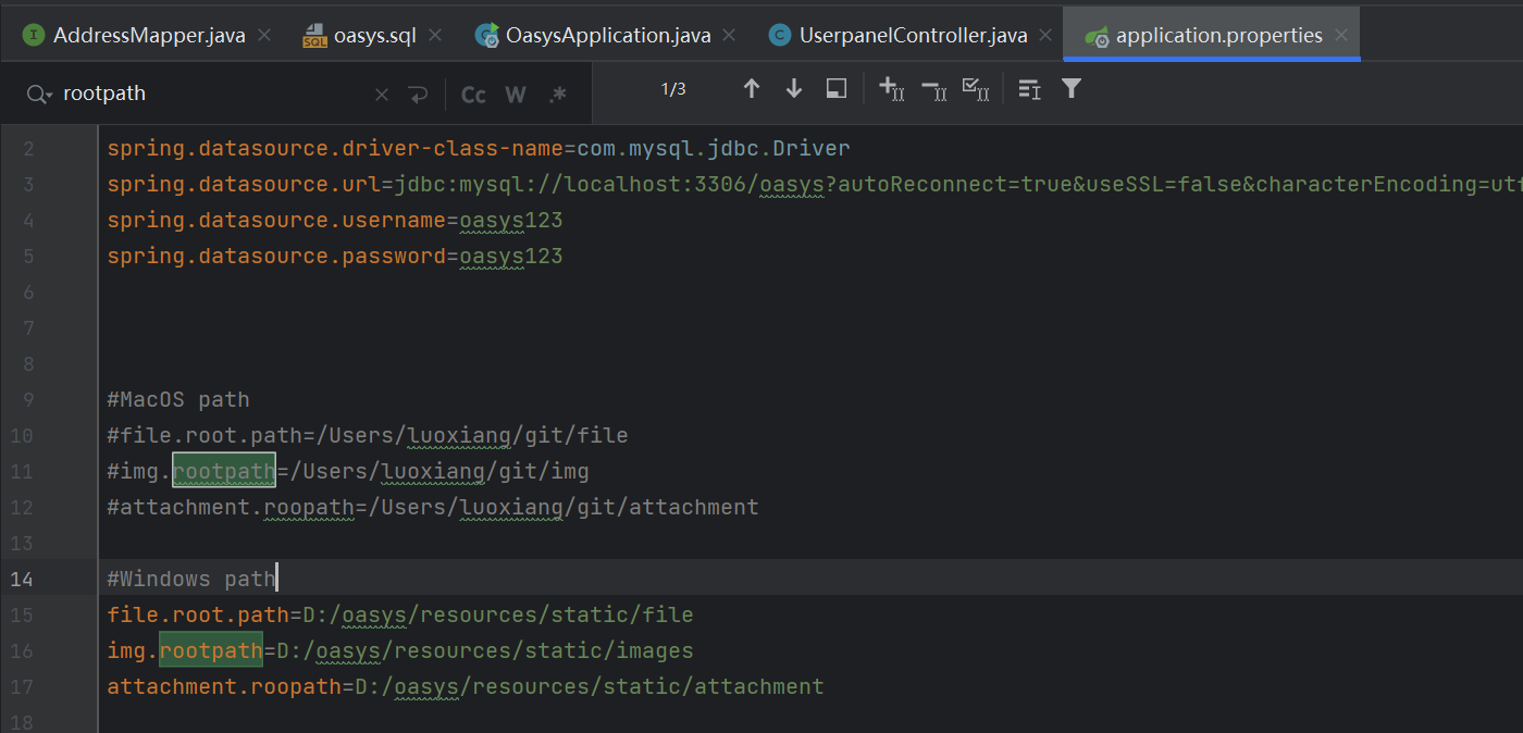 发现以@Value注解定义rootpath的值,而@Value注解的作用就是从项目配置文件中获取信息,于是转到配置文件,搜索关键字:rootpath