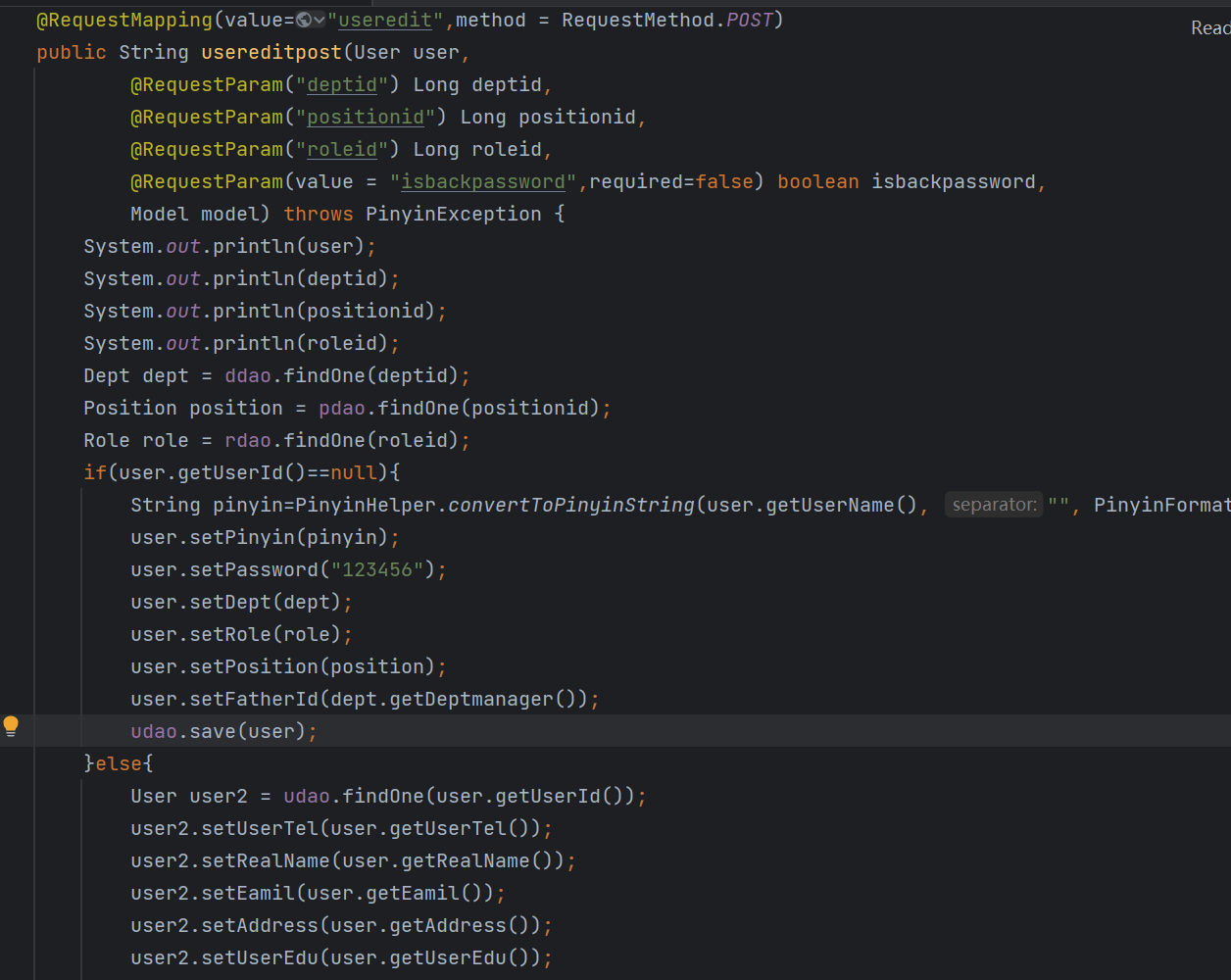 发现AddController层引用该接口,并通过mapper进行数据库操作,在该controller层搜索原接口方法,定位到具体代码块: