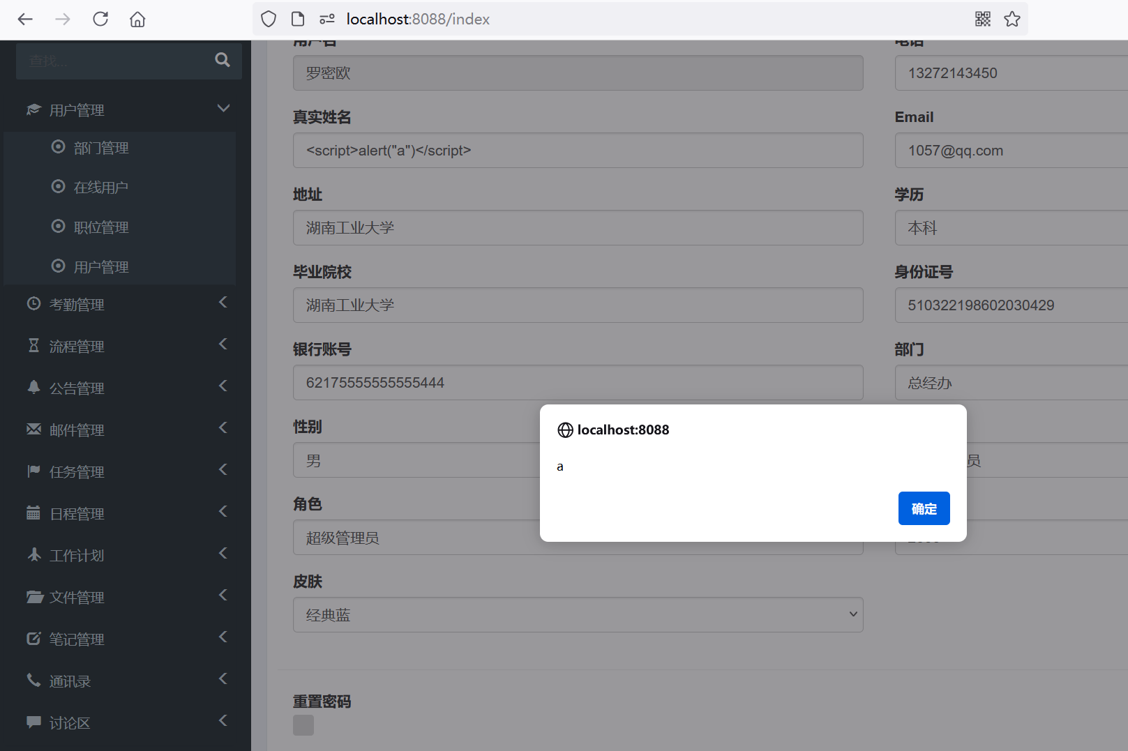 登录后台后,用户处点击修改信息,插入xss代码造成弹窗。