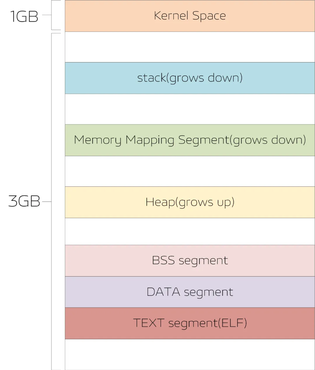 以 Linux 内核 v2.6.7 之后的32位模式下的虚拟内存布局方式为例: