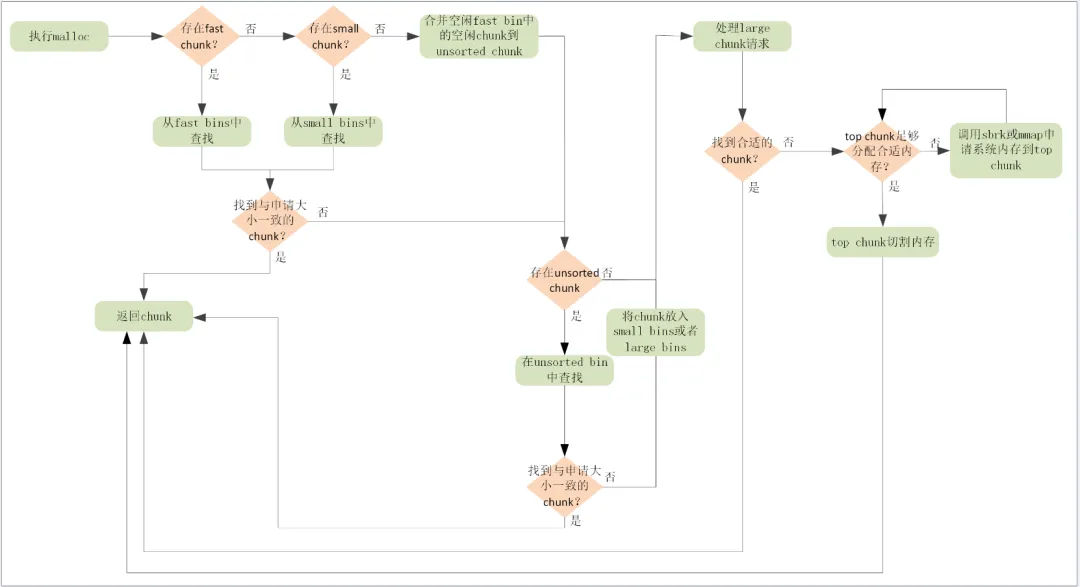 第二步:在 bins 中搜索还没有归还给操作系统的 chunk 块,具体流程如下图所示。