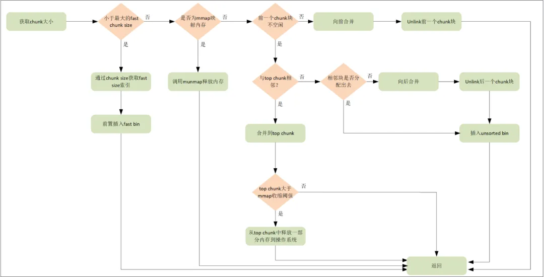 如果 top chunk 大小大于 mmap 收缩阈值(默认128KB),如果是,则对于主分配区则会试图归还 top chunk 中一部分给操作系统,此时 free 结束。