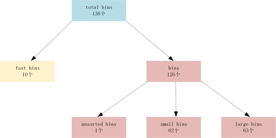 其中根据 bin 的分类,可以分为 fast bin 和 bins,而 bins 又可以分为 unsorted bin、small bin 以及 large bin 。