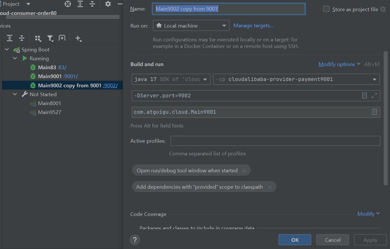 点击9001服务,Copy Configuration,之后配置名字,在配置虚拟机参数-DServer.port=9002,保存,就会看到服务列表里,有新的服务,启动即可。