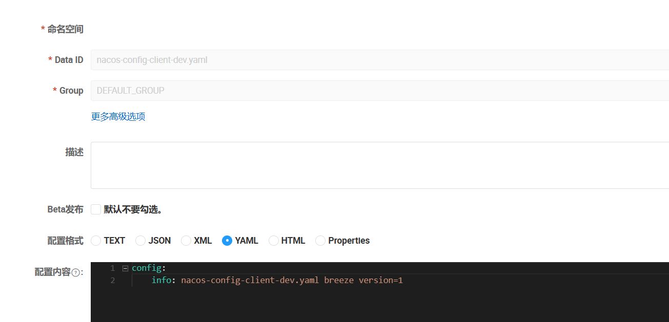 DataId实操:默认为服务名-环境.扩展名。例一个x.name为aa,x.active为dev,x.file-extension为yaml,则改项目的配置文件为aa-dev.yaml