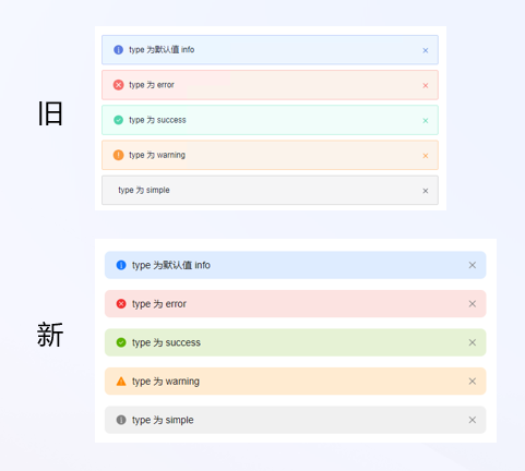 警告组件比较明显的变化是颜色和图标,颜色的层次更加分明,图标的表意也更加准确,比如警告图标,之前是圆形的,现在改成三角形,就更加符合大家的共识。