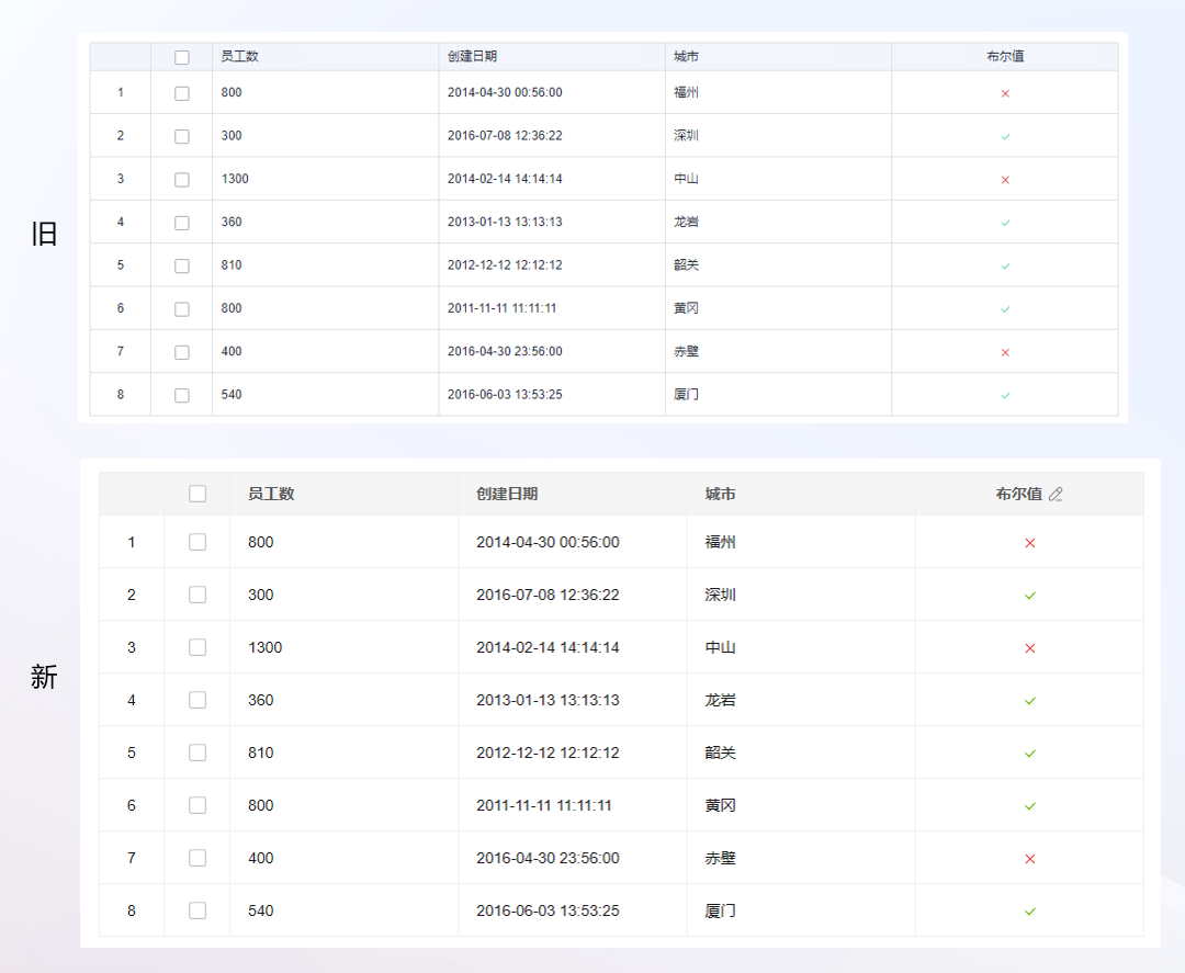 表格组件看起来变化不大,但细看也有很多优化,比如整体线条颜色更浅,更能突出单元格中的核心内容,表头颜色和高度也有一定的调整。