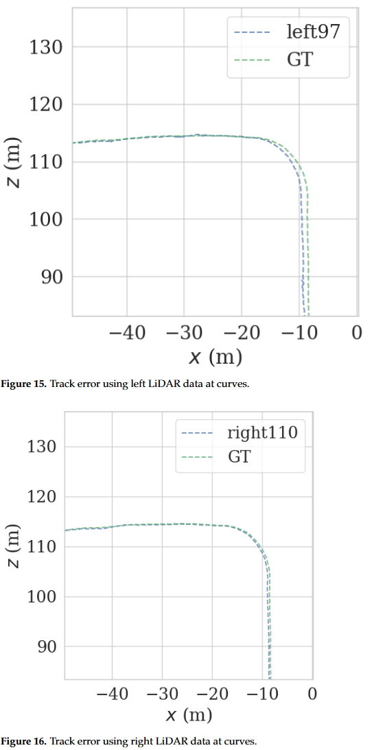 从图9和图10可以看出,每组数据都有4个拐点,变化较大。如图11和图12所示,随着车辆转弯,两侧激光雷达效果匹配点数量急剧减少,导致重定位精度下降,如图13和图14所示。右侧变大,有效匹配点的数量急剧增加,从而导致更高的重定位精度,如图15和图16所示。