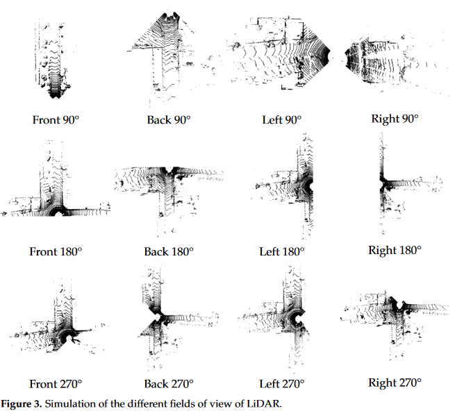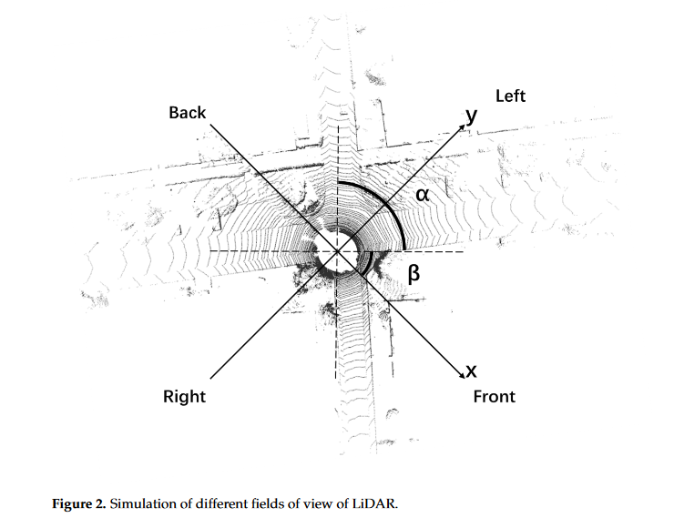 x轴正方向为激光雷达的前方,y轴正方向为激光雷达的左侧,如图2所示。通过提取不同的激光雷达点云区域ROI(感兴趣区域),在前、后、左、右预留不同大小的激光雷达点云区域,模拟激光雷达视场不同程度的变化。可以描绘 ROI 以进行进一步处理。每个区域的LiDAR点云可以描述为:
