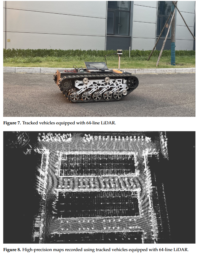 配备64线激光雷达的履带式车辆在真实环境中使用,如图7所示。这里使用的激光雷达是Ouster OS1-64,测量范围为150 m,精度为±2 cm ,垂直视角30°,水平视角360°,垂直角度分辨率0.52°,水平角度分辨率0.09°,旋转速率10Hz。此次测试是在特征明显的复杂城市环境中进行的。如图8所示,履带的左右两侧有弯路、直路,且有明显的大型障碍物。数据集中的道路长度为1秒,持续时间为23秒。所有评估实验均在配备 AMD R7-4800H 处理器、16 GB RAM 和单个 NVIDIA GeForce GTX1650ti GPU 的计算机上运行。