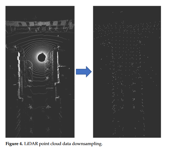 体素下采样根据输入点云数据创建 3D 体素网格(将体素网格视为空间 3D 立方体的集合)[28-31]。然后在每个体素(3D立方体)内,体素中的其他点通过体素中所有点的重心来近似,使得体素中的所有点都由一个重心点表示。体素下采样根据输入点云数据创建 3D 体素网格(将体素网格视为空间 3D 立方体的集合)。然后,在每个体素(3D 立方体)内,使用体素的重心来近似体素中的所有点,以揭示体素中的其他点,以便体素中的所有点都由单个重心点表示。从而减少了点的数量,提高了匹配速度,点云的形状特征基本保持不变,并且保留了空间结构信息。体素网格选择越大,采样的点云越小,处理速度越快;然而,原始点云会过于模糊。较小的体素网格选择将产生相反的效果。同时,需要记录解采样后不同LiDAR点云数据的点数,如图4所示。