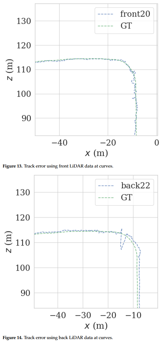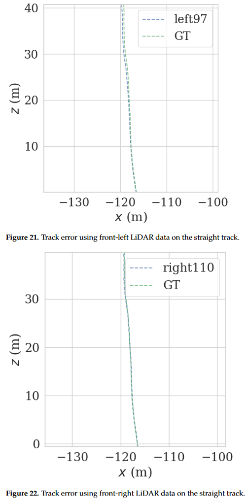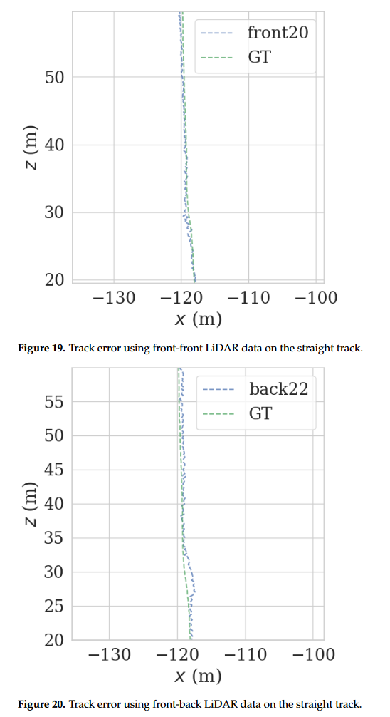 如图17和图18所示,在正常的直线段中,障碍物分布不均匀且距离较近。轻松缩小左右LiDAR视场视觉的影响,导致NDT有效匹配点数量在50到100之间,导致重定位精度降低,甚至丢失位置。在正常直线段,由于前后激光雷达数据大部分为地面点,重定位精度受到严重影响。左右激光雷达点多为有效特征点,特征丰富。如图19和图20所示,在直线段,正面和背面激光雷达数据的定位精度较差。如图21和图22所示,左右两侧LiDAR数据的定位效果良好。