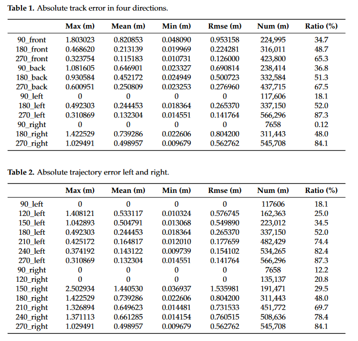 如表1所示,比较了不同方向90°、180°、270°激光雷达点云重定位轨迹得到的RMSE。可见,在同一方向上,激光雷达的视角越大,NDT算法的匹配点越有效,定位精度越高,误差越小。当激光雷达左右视场角为90度时,无法重新定位激光雷达。当前后激光雷达视场角为90°时,可以重新定位。当激光雷达四个方向视场角放大时,正面和背面的精度提升较大,而左右两侧的精度提升较小。