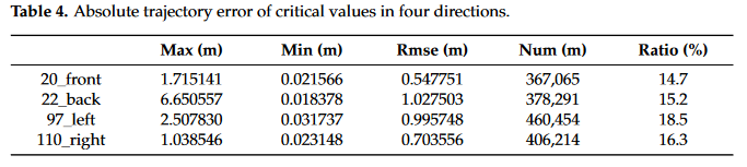 为了进一步探讨LiDAR匹配点云方位和NDT匹配点数量对点云中定位精度和权重的影响,将定位轨迹漂移的影响在中间90°扩展到270° ° 位于左侧和右侧。实验以30度不同角度进行。如表2所示,通过比较激光雷达左右两侧NDT匹配点的数量可以看出,由于正面和后面的NDT匹配点云数量较多,并且在90°左右°~270°,1°时,NDT前后匹配点数量的比例对定位轨迹的精度起着决定性作用。同时也证明NDT匹配点越多,定位精度越高,漂移程度越小。正常驾驶模式下,由于雷达点云前后的点云比较丰富,因此建议多使用前后点云。