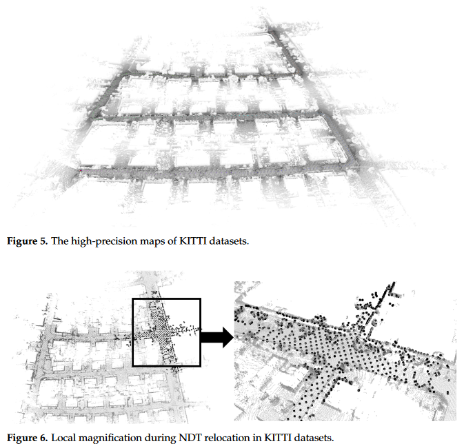 为了测试LiDAR不同视场对NDT重定位算法的影响,我们使用全长864.831 m、持续时间117 s的KITTI数据集。测试平台是一辆配备 Velodyne HDL-64E 的车辆。所有实验均在该平台上进行。车辆的平均速度约为2.5 m/s。所有评估实验均在配备 AMD R7-4800H 处理器、16 GB RAM 和单个 NVIDIA GeForce GTX1650ti GPU 的计算机上运行。 Velodyne HDL-64E 是直接安装在移动底盘上方的 64 线数字激光雷达,具有 360° 水平视场、5–15 Hz 旋转速度、26.8° 垂直视场(+2° 至 -24.8°) ,垂直角分辨率0.4°,水平角分辨率0.08°,点云计数高达130万点/秒,最大范围100m,测距精度±2cm。如图5所示,利用loam算法对KITTI数据集构建了高精度地图。 NDT匹配点是原始点云数据经过ROI处理和下采样后的点,如图6所示。由于体素下采样后原始点云密度不均匀,每个方向的NDT匹配点数量为也不规则,因此各个方向的无损检测匹配点的定位精度是不同的。本文代码设置的下采样因子为3.0。变换epsilon为0.05,步长为0.1,分辨率为2.0,最大迭代次数为30。本文采用均方根误差(RMSE)来衡量定位精度。 RMSE 是预测值与真实值之间的偏差的平方与观测值数量之比的平方。