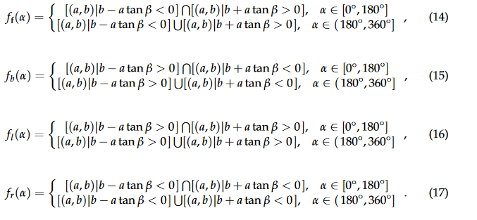LiDAR点云区域的前、后、左、右分别用ff(α)、fb(α)、fl(α)、fr(α)表示。激光雷达点云内部的点用(a,b)表示,α为切割激光雷达点云的视角,β为0°到90°,如图3所示。